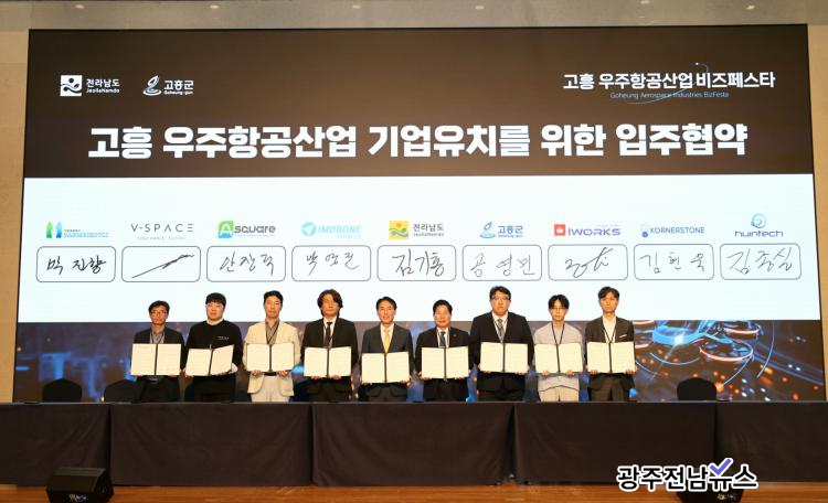 | ﱺ, 2025 װ 佺Ÿ Ȳ . 공영민 고흥군수(왼쪽 6번째)가 지난 22일 경기도 소노캄 고양에서 열린 2025 고흥 우주항공산업 비즈페스타에서 우주항공(드론, UAM) 관련 20개 기업과 ΰ Կ ϰ ִ.(=ﱺ) |